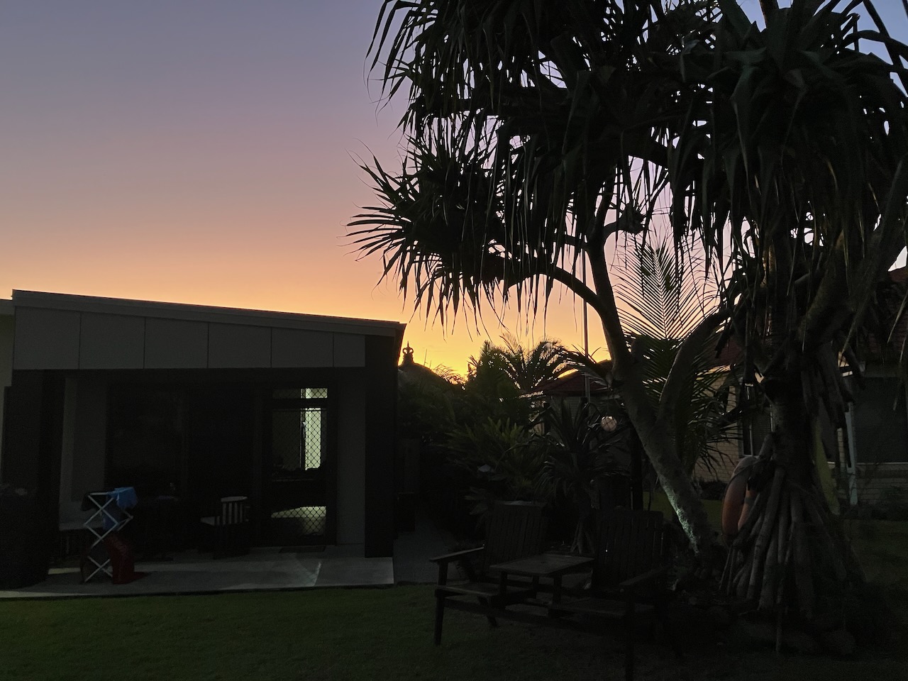 Gegen 17:00 bricht schon die Dämmerung herein, die in diesen Breitengraden sehr kurz ist. Hier mein Gartensitzplatz.
