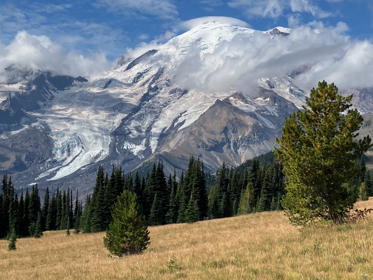 Trotz schlechter Prognose startete unsere Wanderung mit einem herrlichen Blick auf den Mt. Rainier.