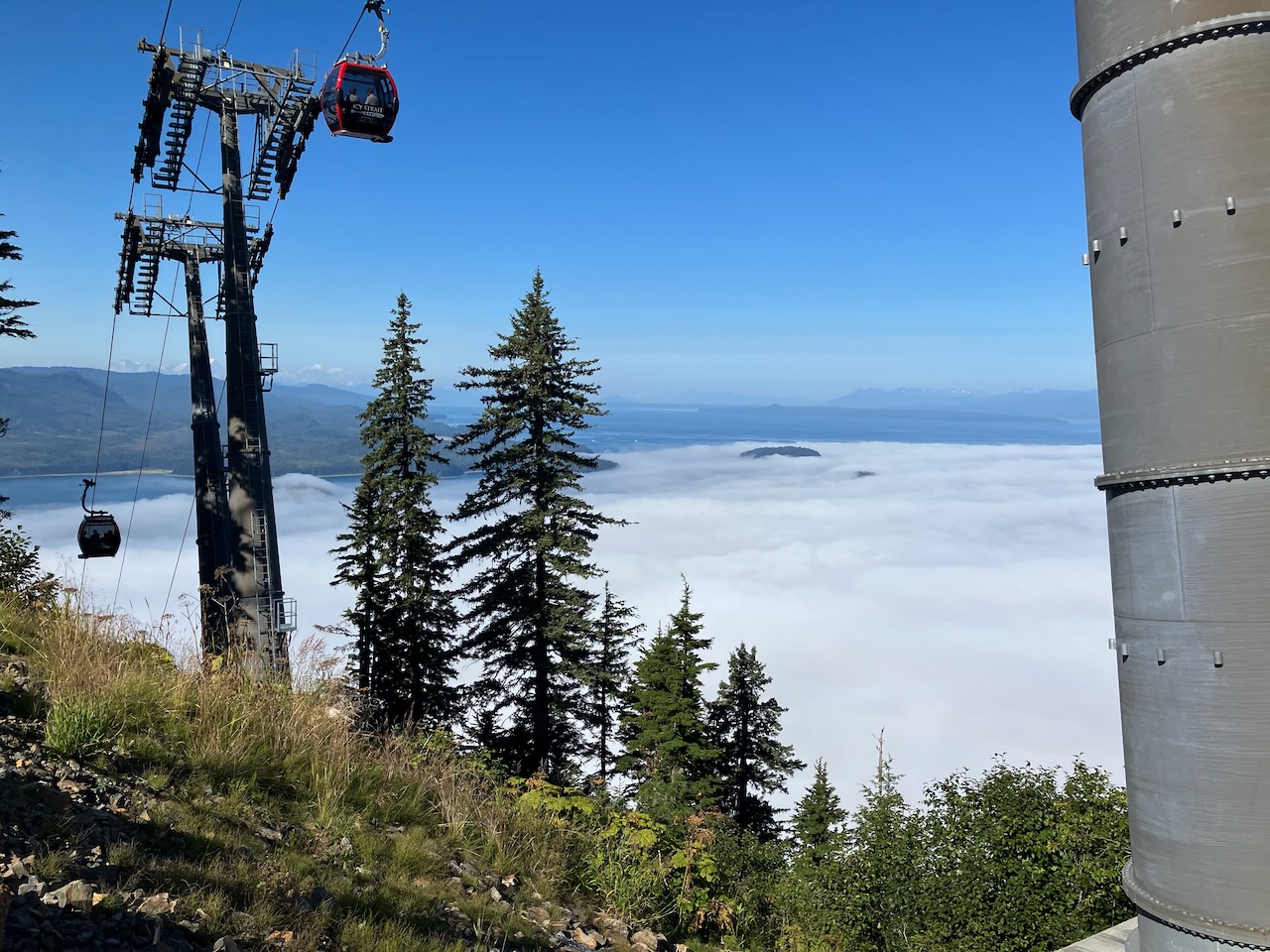 Die Hauptattraktion ist eine Doppelmayer-Bahn, welche uns über den Nebel auf einen Kopf bringt ...