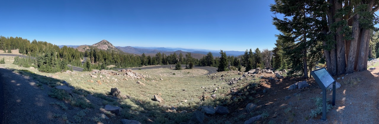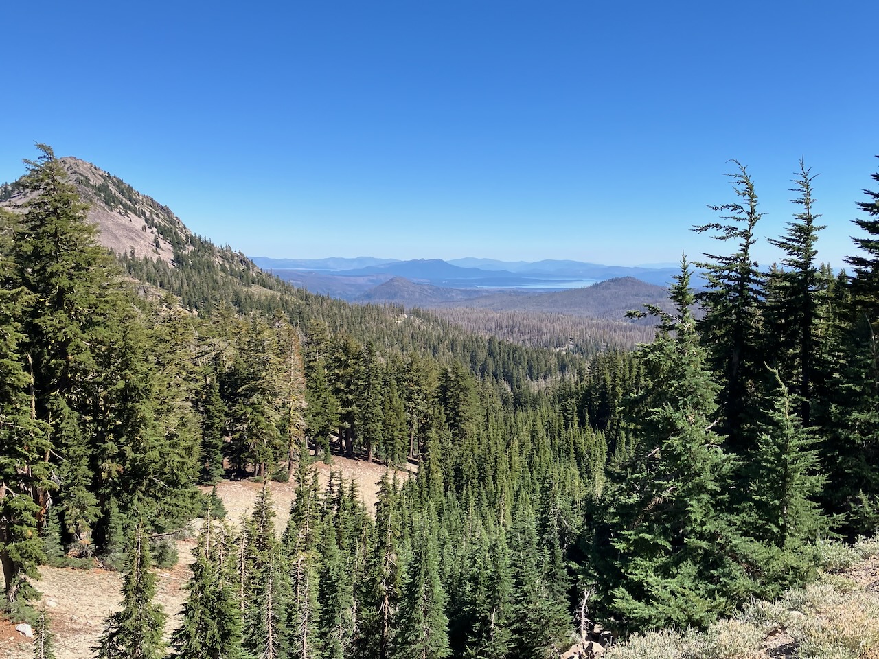 Wir sind auf dem höchsten Gebirgszug weit und breit – entsprechend toll ist die Weitsicht. Man sieht den Lake Almanor von gestern, rund 1 Std. Autofahrt weg, und das ist noch nicht einmal der Horizont.