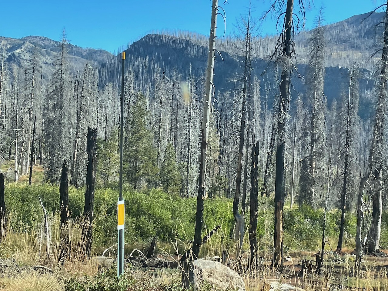 Leider gab es in dieser Region kürzlich mehrere schlimme Waldbrände. Der schlimmste war das Dixie-Feuer von 2021. Es vernichtete fast 4'000 km2 Wald, also fast 1/10 der Schweizer Fläche (ein Quadrat von 64 km Seitenlänge) und war damit das grösste je beobachtete Feuer in Kalifornien, das aus einem einzigen Brandherd entstand.