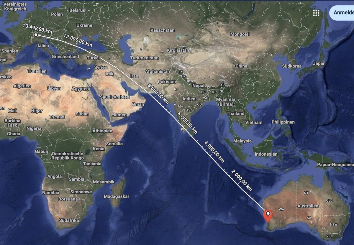 Nun geht es also zurück in die Schweiz, knapp 13'500 km kürzeste Distanz.