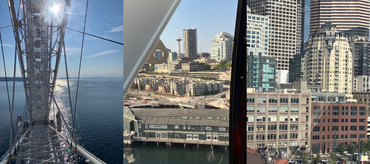 Links: Blick auf den Sund (Seattle liegt ja nicht am offenen Pazifik sondern an einer fjordartigen Bucht) – Mitte: die Space Needle ist Ziel von morgen – Rechts: die Hochhäuser sind interessant gestaltet.