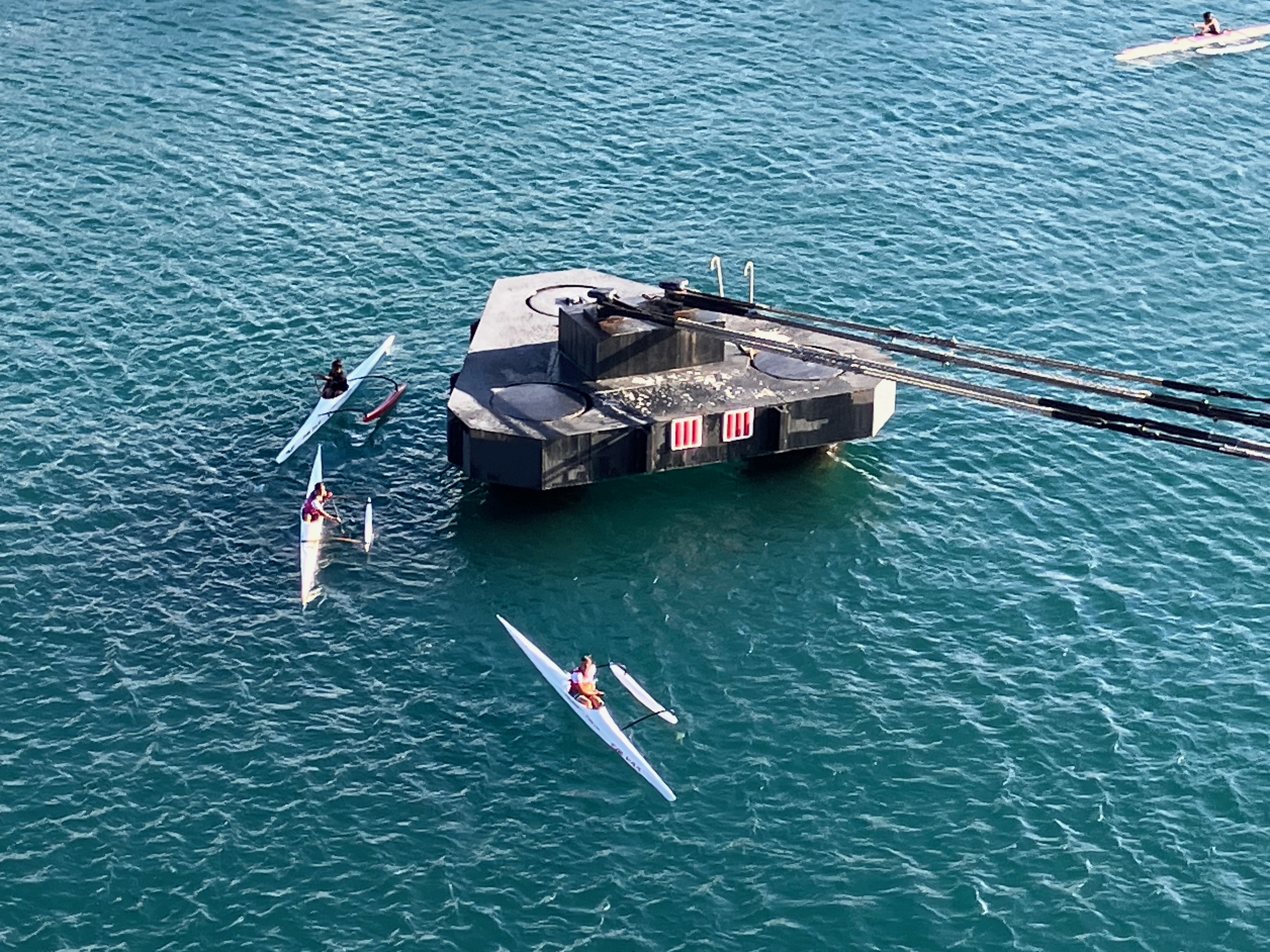 Der Poller unseres Schiffes dient als Wendepunkt eines Ruderrennens. Kanus gibt es hier schon seit 1000en Jahren, aber diejenigen aus Verbundstoffen sind anerkannt die schnellsten.