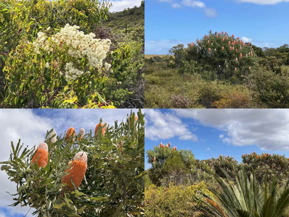 Auch im Herbst blüht es allenthalben. Oben lins: Marri, eine Eukalyptusart, aus welcher auch Holzböden gemacht werden. Rest: Banksien: Selten gewordene wilde Buschart, welche in verschiedenen Farben blüht.