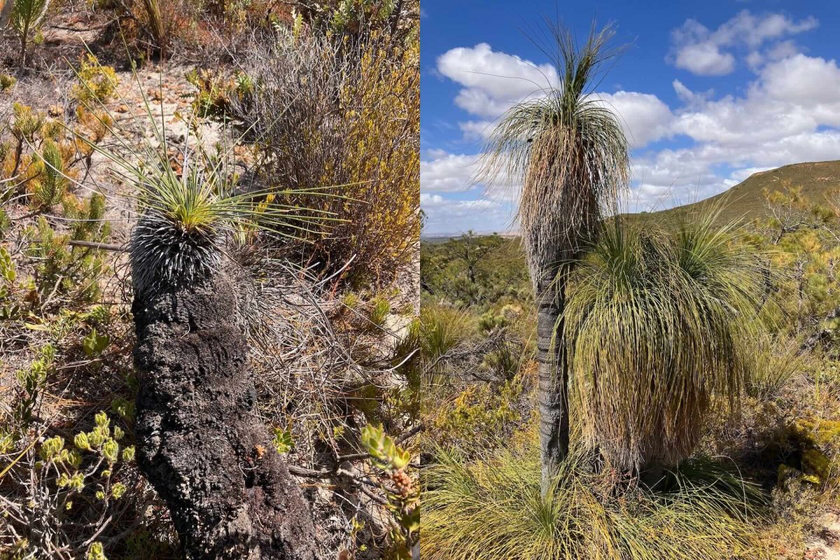 Der Grass Tree ist eine faszinierende Pflanze: Links: neuer Trieb wächst aus abgebranntem Stumpf. Rechts ausgewachsenes Exemplar. Den Aborigines dienten die Bäume als Wegmarken, da sie den Rest der Büsche überragen.