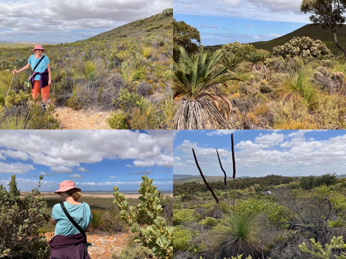 Auch der Mount Lesueur durfte wieder nicht fehlen: links oben: Wanderung durch den Busch; rechts oben: Blick auf den Gipfel; links unten: Aussicht vom Gipfel; rechts unten: gottseidank das Auto wieder gefunden.