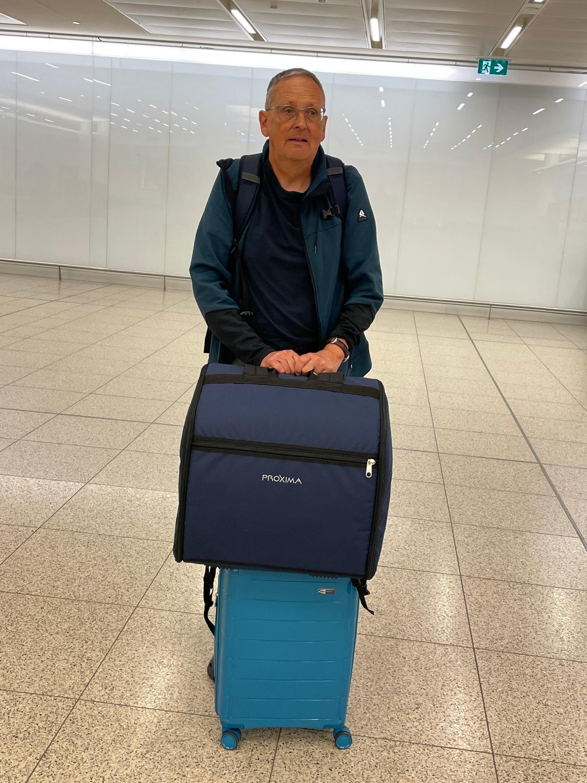 Leicht gezeichnet vom Schleppen des digitalen Akkordeons wartet der Reisende auf die weiteren Koffer im Flughafen Perth.