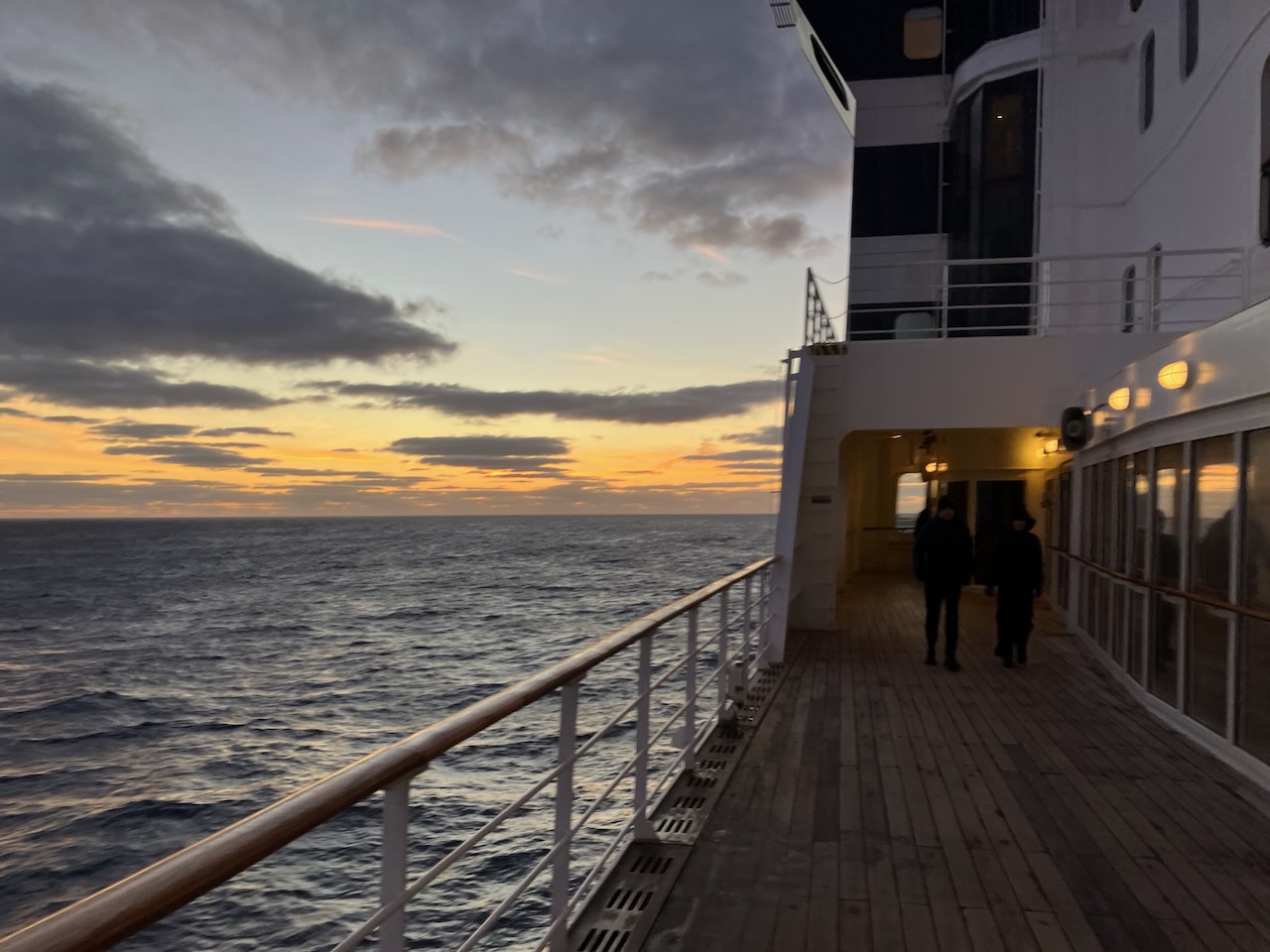 Der Atlantik ist um diese Jahreszeit rauh, das Wetter geprägt von kräftigen Tiefdruckgebieten. Entsprechend sind die Wellen oft 7 m hoch und mehr, das Wasser im Pool wird herumgeschleudert. Letzte Nacht war besonders unruhig und das Schiff so bocking, dass die Tanzshow aus Sicherheitsgründen abgesagt wurde.